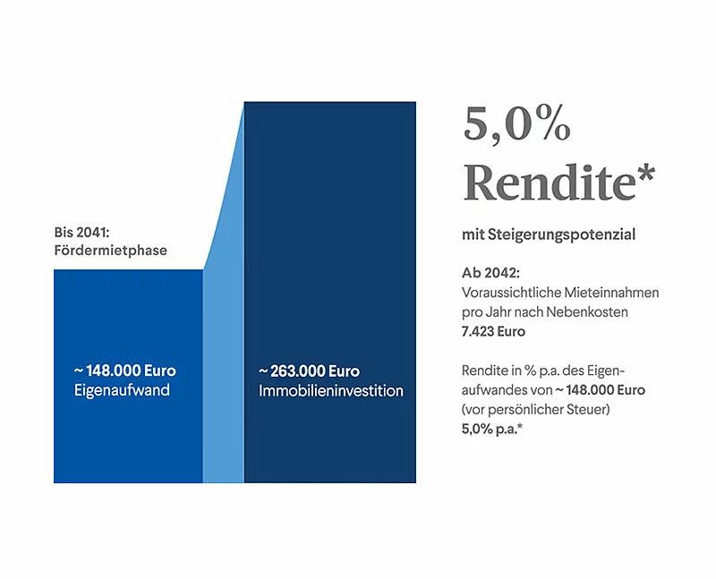 Eine Beteiligung an diesem IFA Bauherrenmodell ist bereits ab einem initialen Eigenkapital von rund 16.640 Euro p.a. über drei Jahre möglich: Mit einem Eigenaufwand nach Steuer, Nebenkosten und Darlehenstilgung von rund 65.000 Euro ermöglicht das Investmentmodell bei Kreditzeichnung eine Immobilienbeteiligung von rund 133.000 Euro. Dies entspricht einer erwarteten Rendite von rund 5,0% p.a.*.