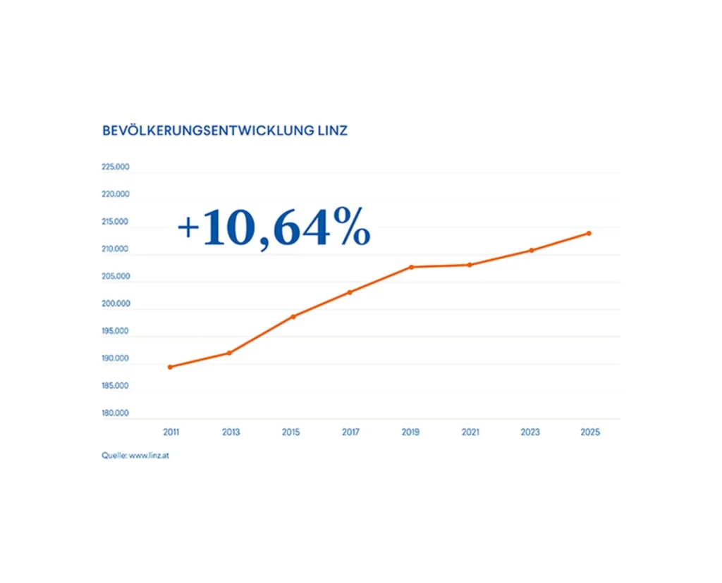 In Linz ist auch in Zukunft von einem starken Wachstum und einer damit einhergehenden hohen Nachfrage nach Wohnraum auszugehen. Und davon profitieren alle Investor:innen des Investments „Zelkingerstraße 16”.