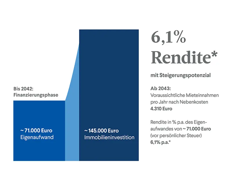 Ein Investment in dieses IFA Bauherrenmodell mit ideeller Beteiligung über eine MEG und Steueroptimierung ist bereits ab einem initialen Eigenkapital von 16.650 Euro p.a. über drei Jahre möglich: Mit einem Eigenaufwand nach Steuern, Nebenkosten und Darlehenstilgung von rund 71.000 Euro ermöglicht das Investmentmodell bei Kreditzeichnung eine Immobilienbeteiligung von rund 145.000 Euro. Dies entspricht einer erwarteten Rendite von rund 6,1% p.a.*.